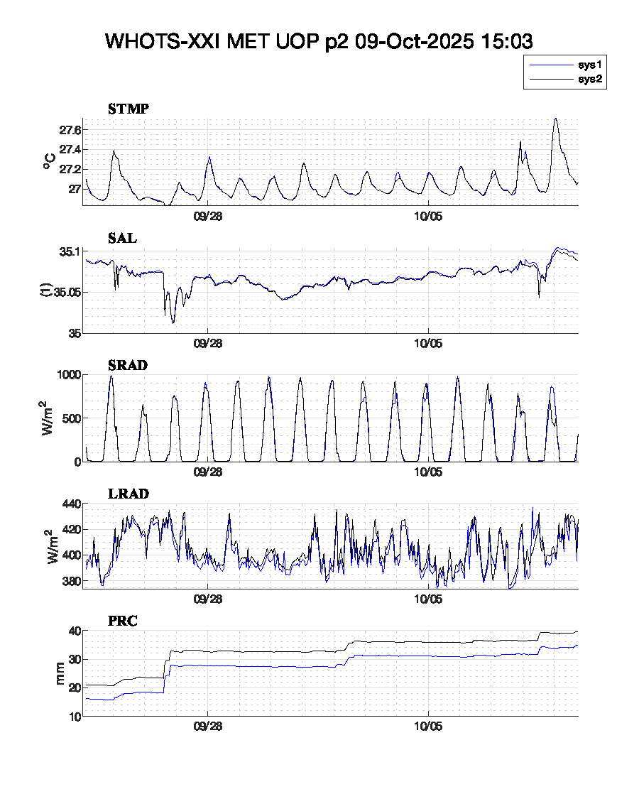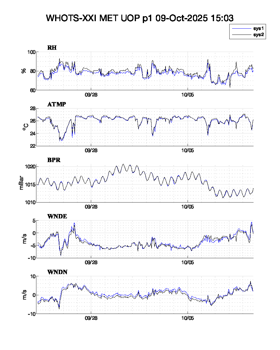WHOTS-21 Deployed: September 24, 2025 at 00:53 UTC Met data text files: Daily transmission: Logger 5 Logger 42 Complete listing: Logger 5 Logger 42 Plots: plot-1 or plot-2 or plot-3 | |